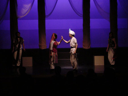 ジン二人によって引き合わされるカマル王子とブドゥール姫。